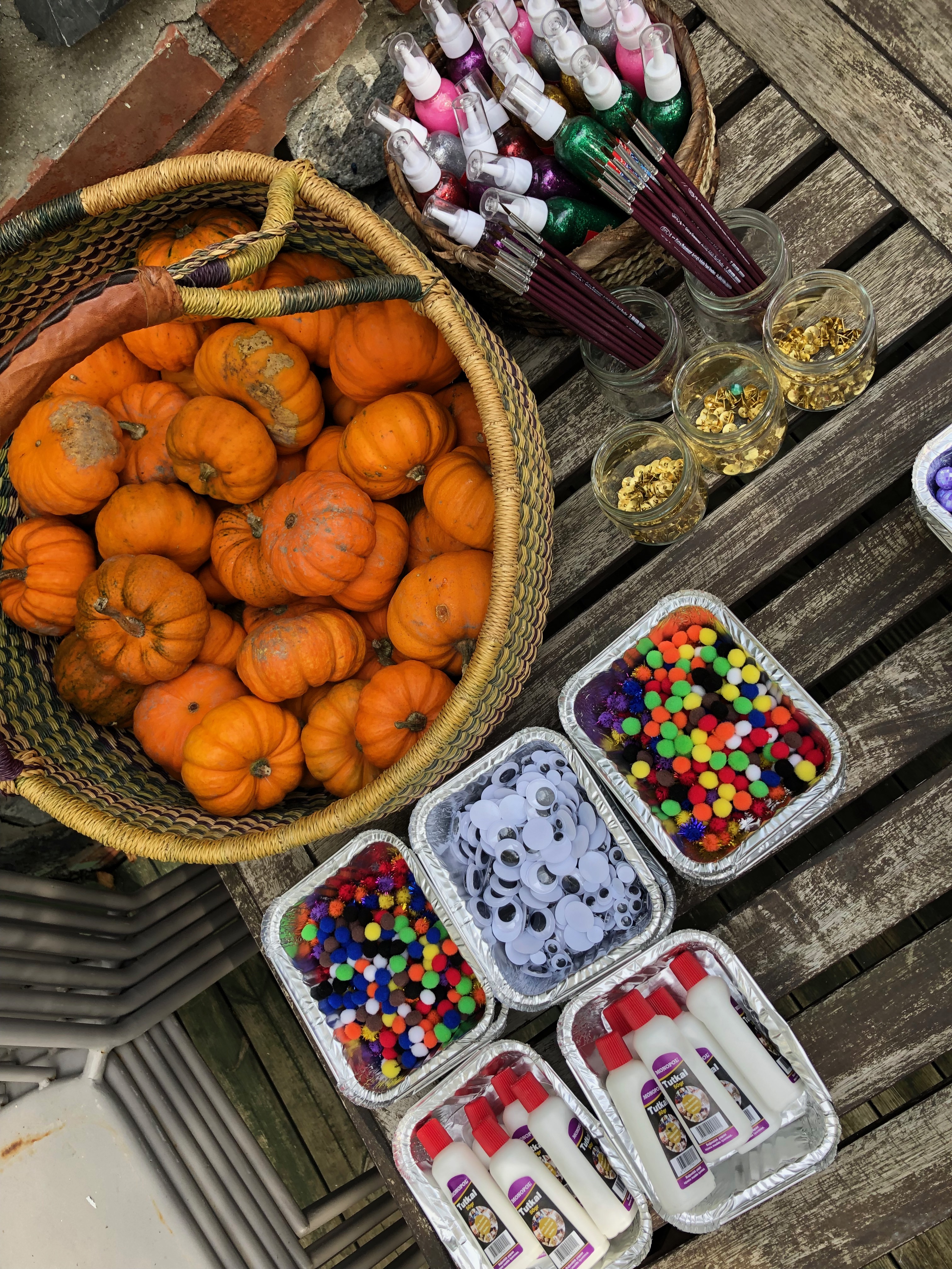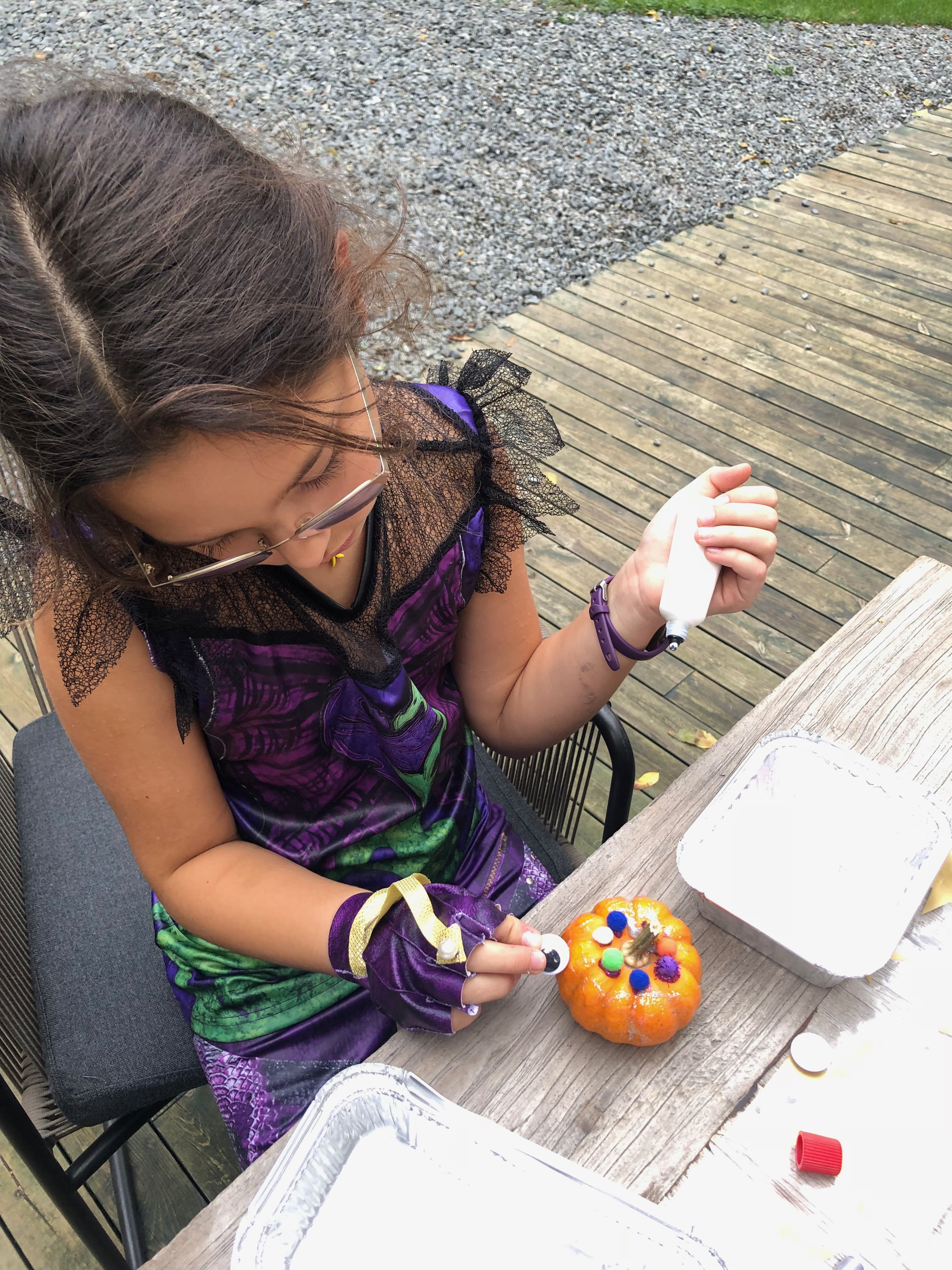 no eksioglu party would be complete without some art activities, of course. treat bags decorated with sharpies for our trick-or-treating treasure hunt; pipe cleaner and plastic spider rings decorated with beads as a spooky accessory; and finally, tinker tray mini pumpkins. the girls loved the pumpkin decorating; especially when i told them they could use as much glitter glue as they wanted! luckily the weather was beautiful, so we were able to the arts and crafts outdoors, making me even more relaxed about the copious use of sticky glitter products!